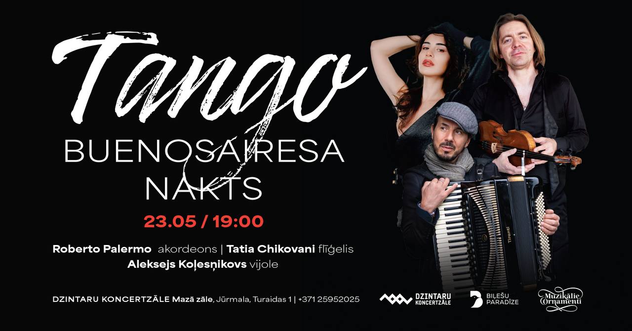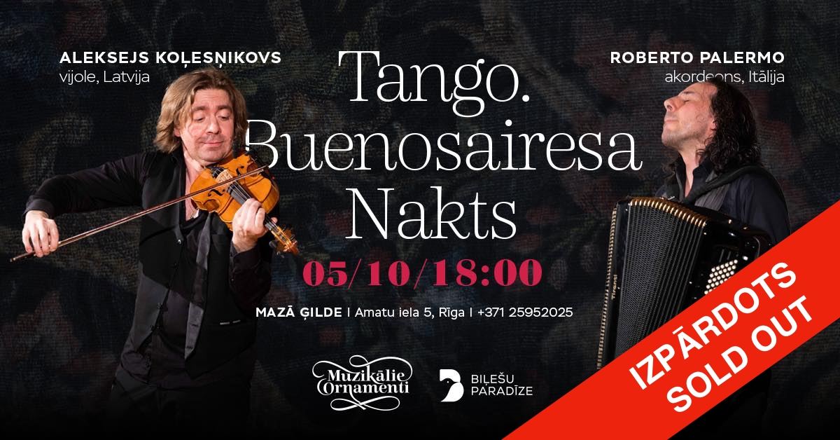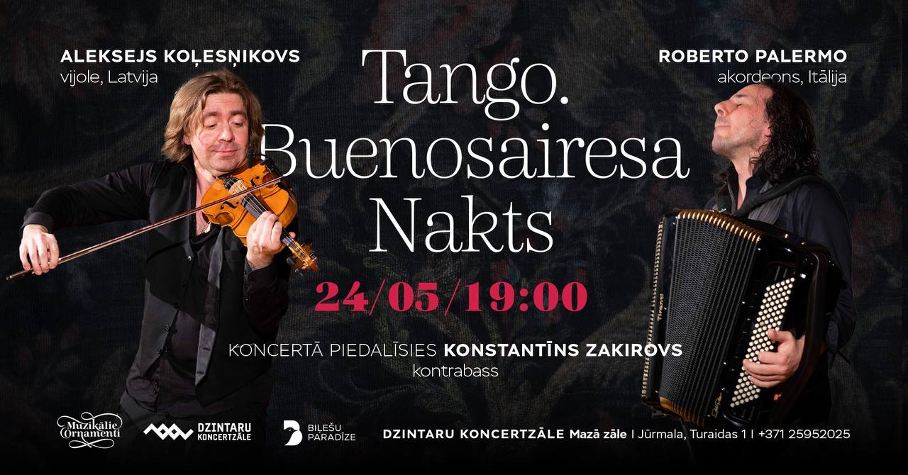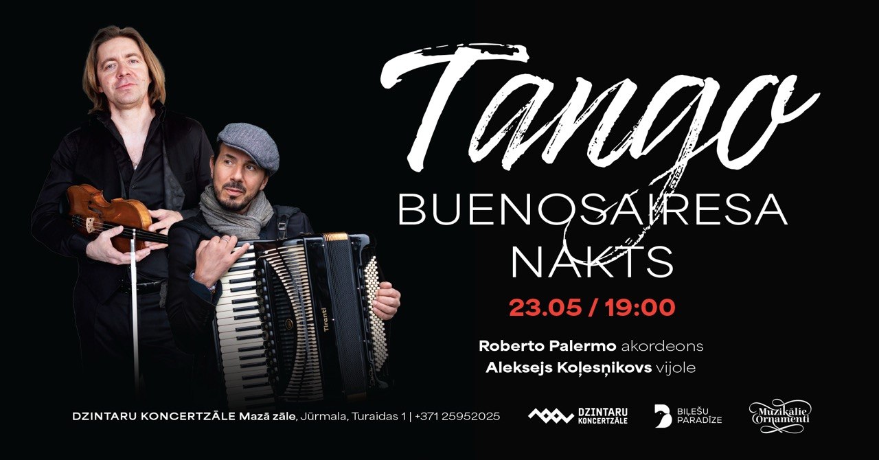 Divi talantīgi mūziķi: rīdzinieks, vijolnieks ALEKSEJS KOĻESŅIKOVS un temperamentīgais itāļu akordeonists ROBERTO PALERMO jums piedāvā mūzikas programmu TANGO stilā. Kura jūs aizvedīs dienvidnieciskā vasaras mūzikas vakarā un liks jums aizmirst par visām ikdienas problēmām un piepildīs ar pozitīvu dzīves enerģiju.